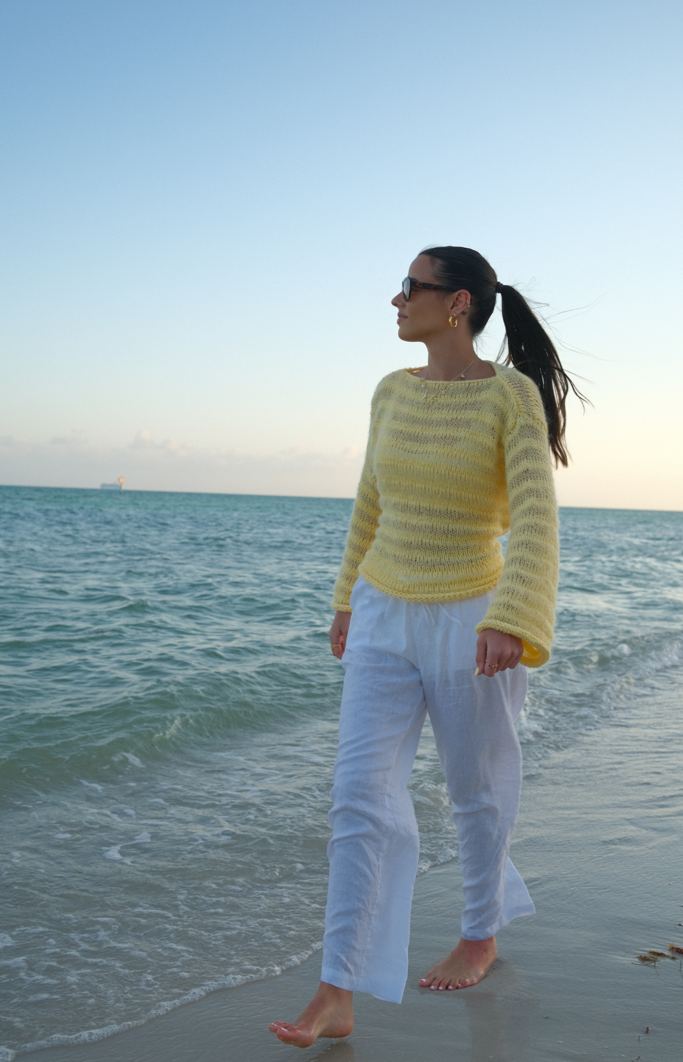 Handmade from a cozy blend of mohair and soft acrylic, the Sunny Sweater is a light, breathable staple for the season. With its airy feel and effortless style, it’s the perfect piece to brighten up your everyday wardrobe.