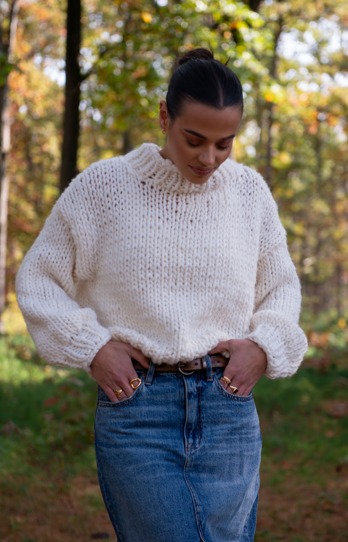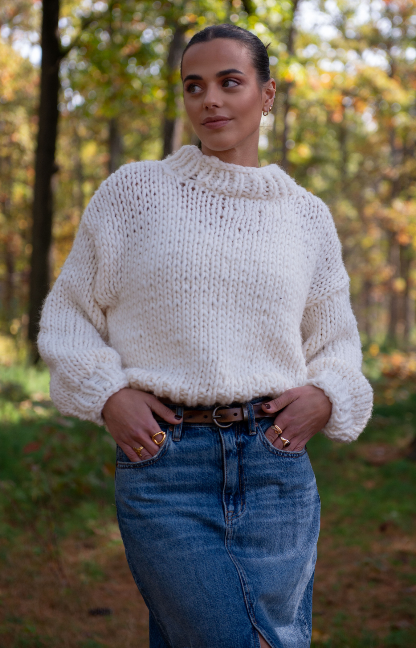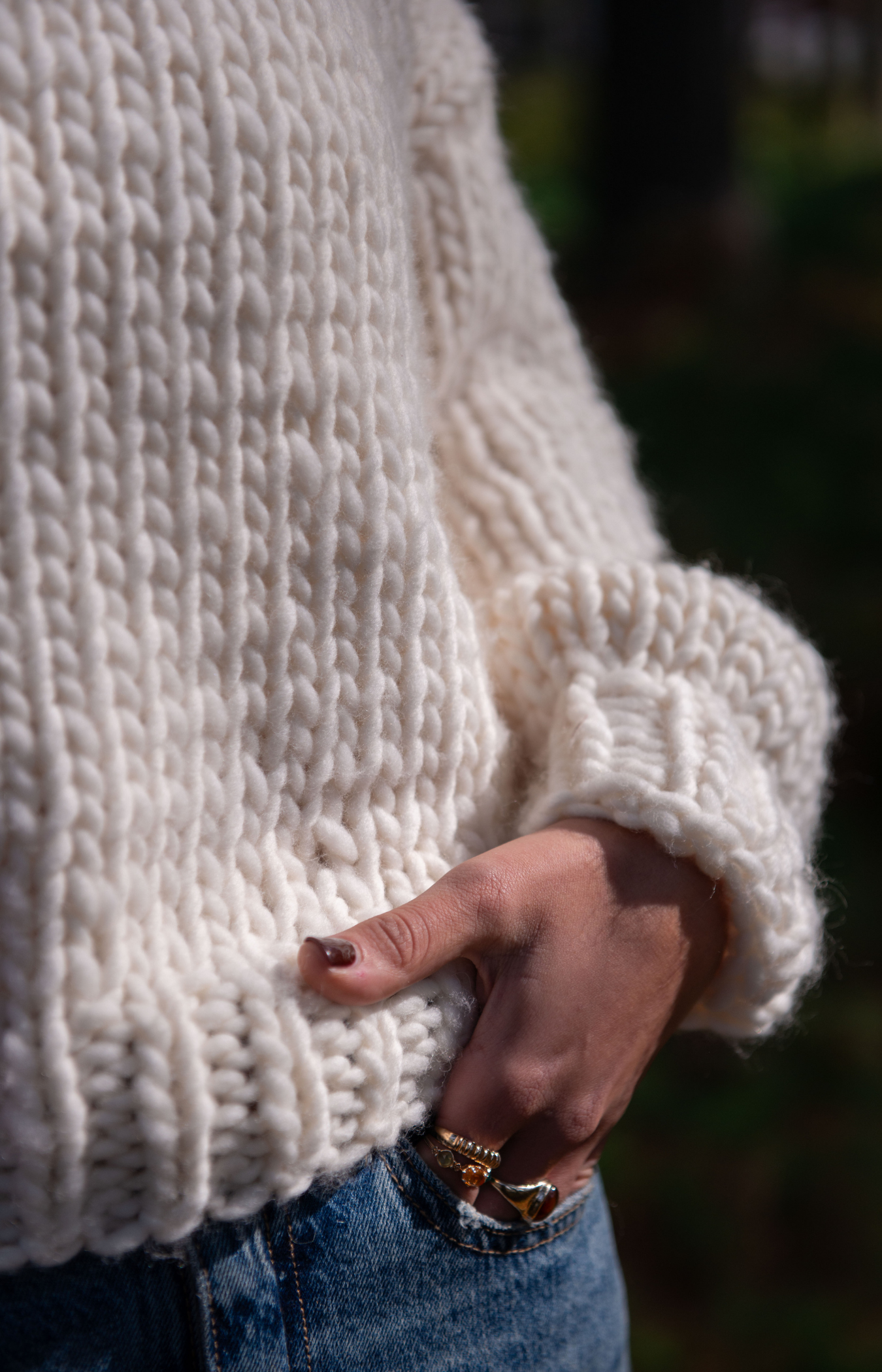 Your favorite chunky knit, designed to keep you cozy and warm all season long. Featuring the perfect neckline for effortless layering, this 100% wool sweater is hand-knitted with care for timeless comfort and style.